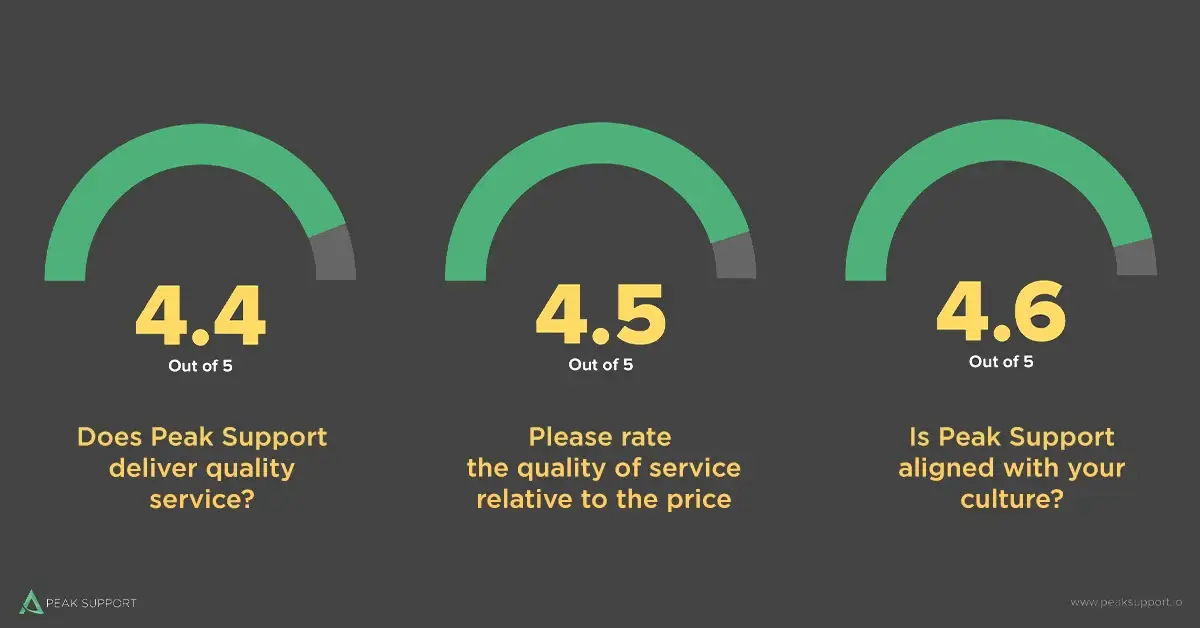 We also ask our clients if our service is high quality, if they get good value for the price, and if Peak Support is aligned with their culture. This year, we scored 4.4 out of 5 for quality, 4.5 out of 5 for the quality of service in relationship to the price, and 4.6 out of 5 for culture – matching the results we achieved last year.