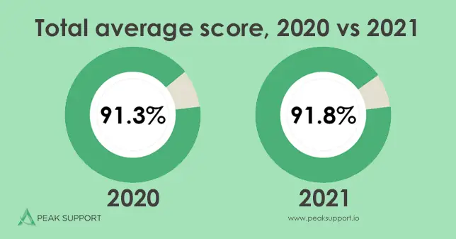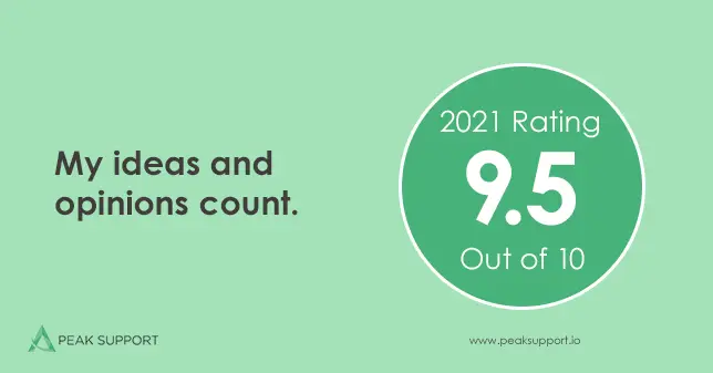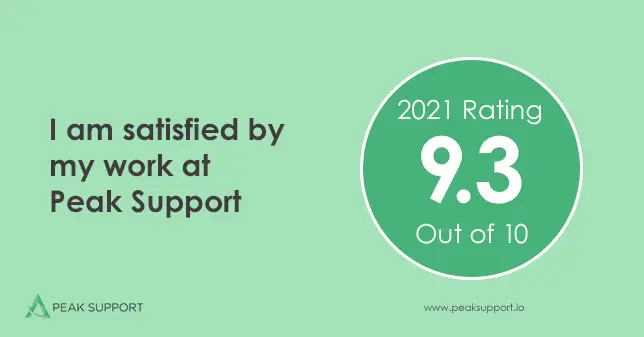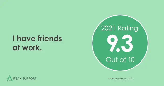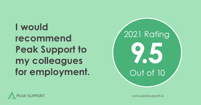 Peak Support received a high score of 9.5 out of 10 for our team’s likelihood of recommending Peak Support to colleagues. This is also an increase compared to 2020’s score of 9.3. We receive a high number of referrals from employees to our talent team, which has helped us hire the great people we need for our new and growing clients!