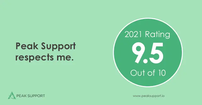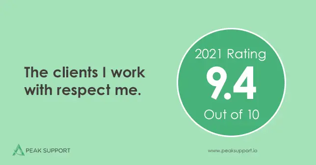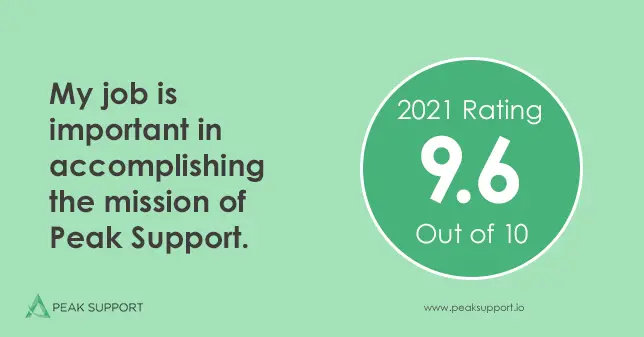 Employees gave a 9.4 rating which is slightly higher than last year’s rating. Our relationships with clients are a critical part of maintaining our success at Peak Support. One of our guiding principles is that we work with “clients we believe in” and ensuring that we work with clients who will treat our teams with respect is a non-negotiable part of our sales process.