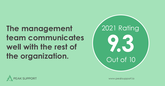 Our rating in efficient management communication has gone up compared to previous year’s ratings. We received a 9.3 rating. Our employees are a massive reason for the success of Peak Support, they ARE Peak Support. We are constantly seeking new ways to improve and do right by our team. This survey allows us to analyze areas where we can improve and assess the qualities our team believes makes their experience a positive one.