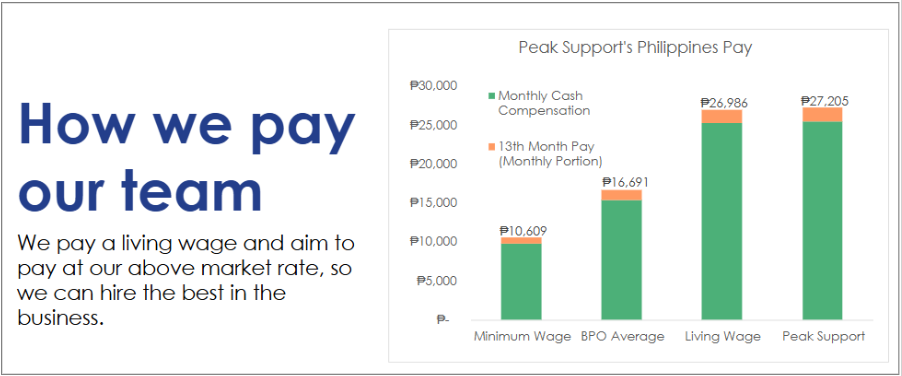 Peak Support’s Answer: In the Philippines, our all-in monthly cash compensation comes to 27,200 PHP/month. We pay Manila rates throughout the country, so we are significantly above market in rural areas. Wages in our other locations are also available upon request.