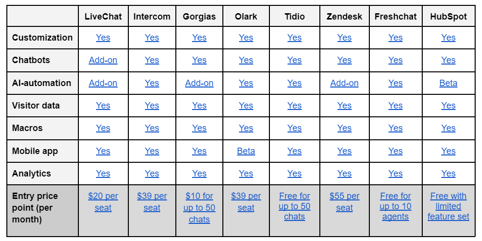 To make the process even easier for you, we created this cheat sheet with standout features for each of the tools above:For small businesses and startups on a tighter budget, Freshchat provides a free plan for up to 10 agents. Freshchat is best for companies using Freshdesk, so if you’re not on Freshdesk and you want seamless integration with your existing customer support tool, consider LiveChat or Olark instead.