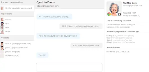 Tidio offers a free plan for up to 50 chats per month. Paid plans start at $26 per month, with pricing based on chat volume.