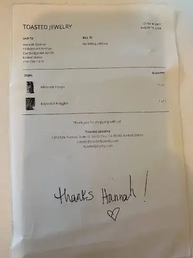 I recently received a package from Toasted Jewelry with a simple “Thanks Hannah!” and a heart written on the receipt. A note like this distinguishes Toasted from the much larger corporations they compete with, and aligns with their brand focus on “Hand Crafted and Ethically Sourced” jewelry.