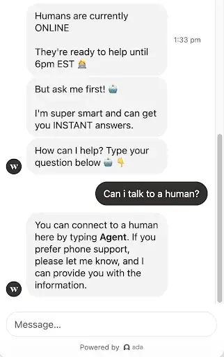 If the customer still wants to talk to a human, the bot tells them how to get human help, including sharing the current average wait time for human live chat support.