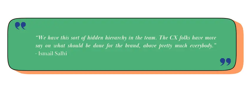 “We have this sort of hidden hierarchy in the team. The CX folks have more say on what should be done for the brand, above pretty much everybody,” Salhi says.