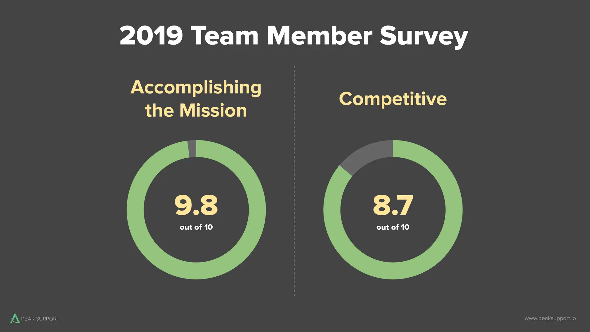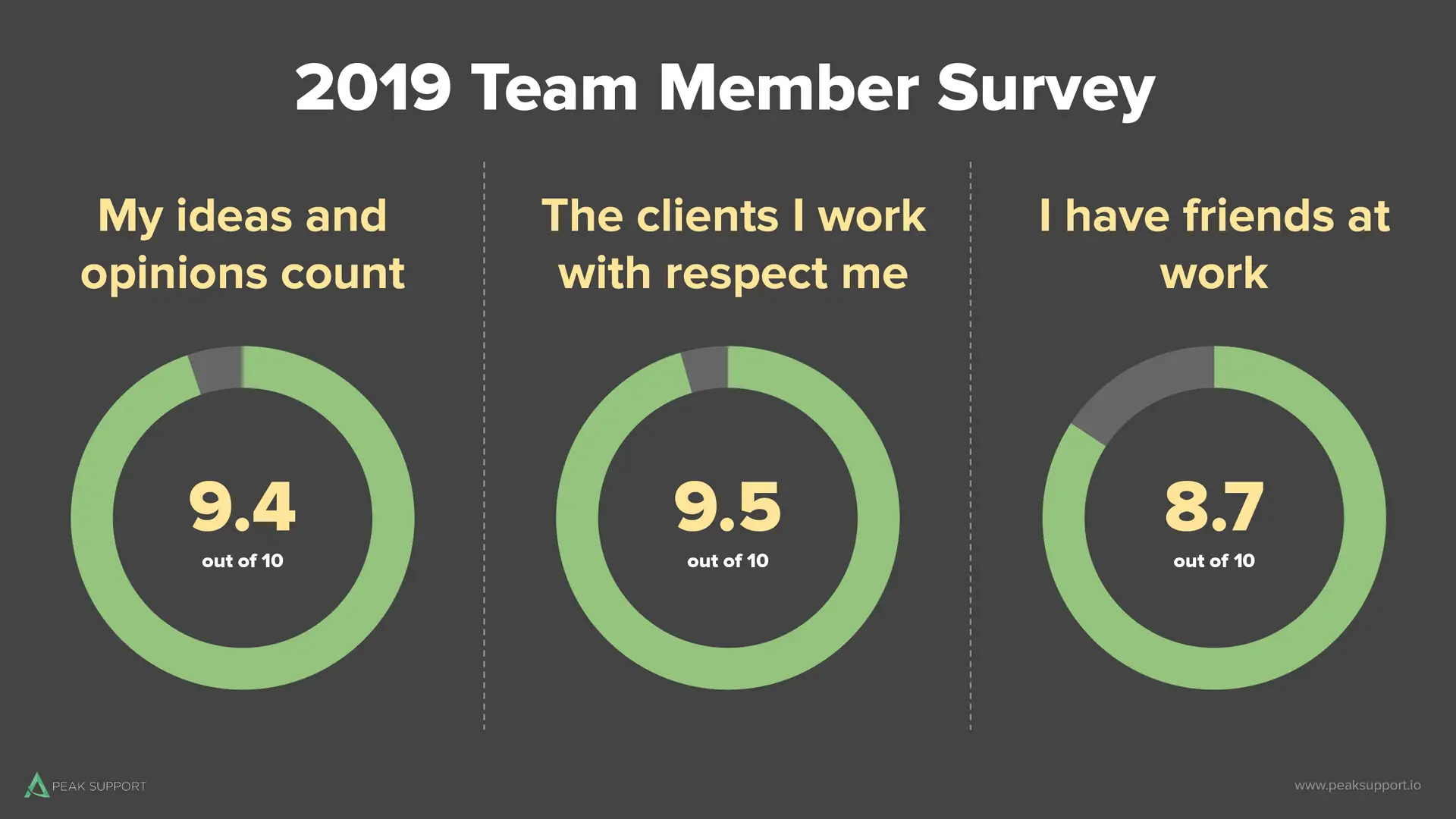 Finally, we ask three big questions to determine our team members overall satisfaction with their work. One of the biggest takeaways for us is that everyone knows how their contributions impact our collective success. We’ve done a good job communicating the Peak Support mission and connecting each individual’s role to the big picture.