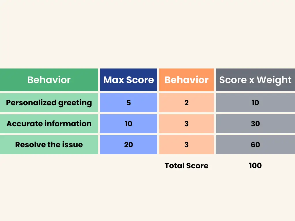 If the agent failed to understand the issue and therefore didn’t resolve it, they might get a “0” for that behavior, which means their QA score would drop down to a total of 40.