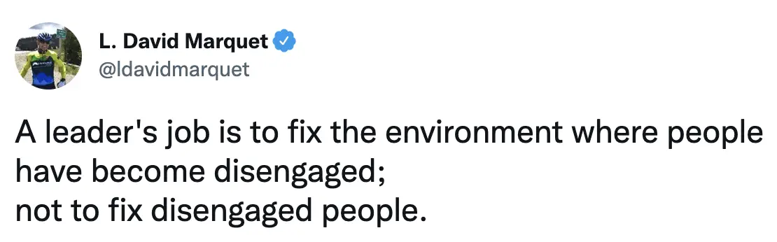 It’s clear that engaged employees perform better. It’s also important for your leaders to take responsibility for their role in employee engagement. As author L. David Marquet says, “A leader’s job is to fix the environment where people have become disengaged; not to fix disengaged people.”