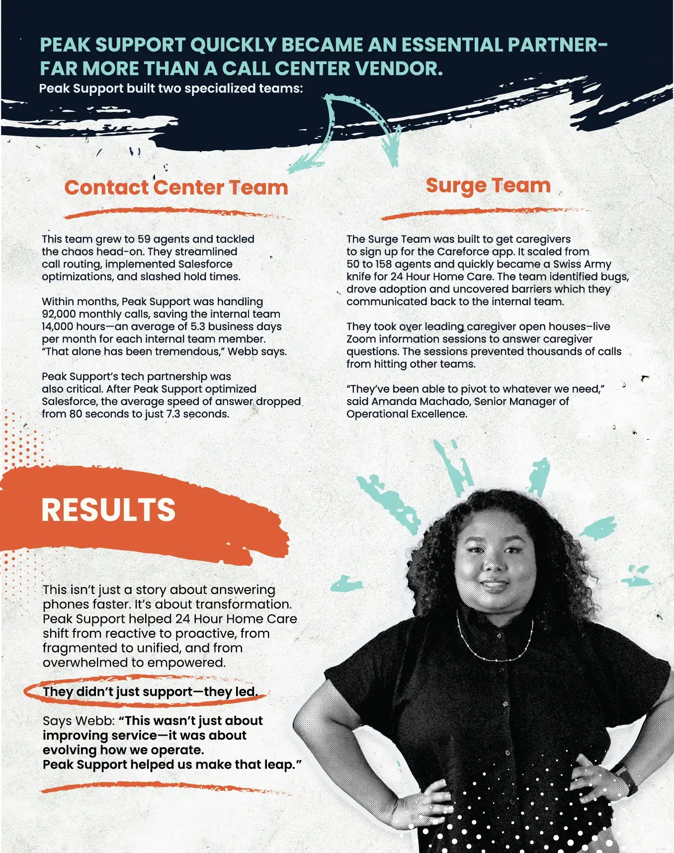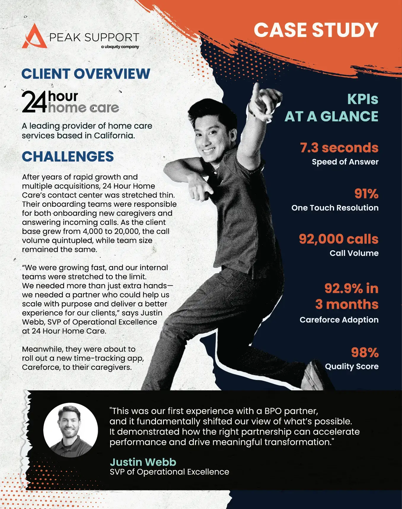 24 Hour Home Care is a fast-growing California-based provider of home care services. As their client base expanded from 4,000 to 20,000, call volume quintupled but their internal teams stayed the same size. Their contact center was juggling caregiver onboarding, high call traffic, and rising service expectations, all while preparing to roll out a new time-tracking app to thousands of caregivers. They needed a partner who could help them scale with purpose, reduce strain on internal staff, and strengthen the overall caregiver experience.